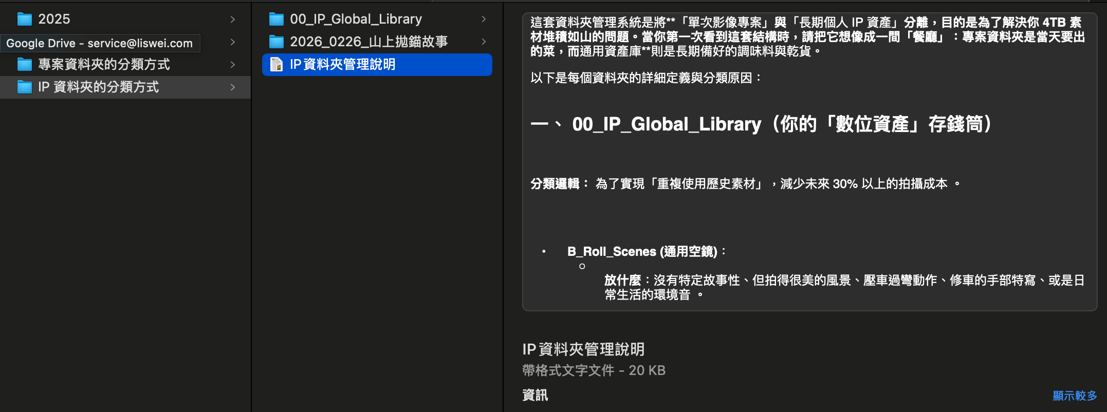 我自己拍騎旅影片的這幾年,光是 2025 年一整年的資料就累積了超過 3TB 的素材。因為工作繁忙,再加上有時候短影音需要快速出片。在那一年我頂多就是用日期去分類資料夾,因為光是「要出片」這件事就已經讓我忙了。